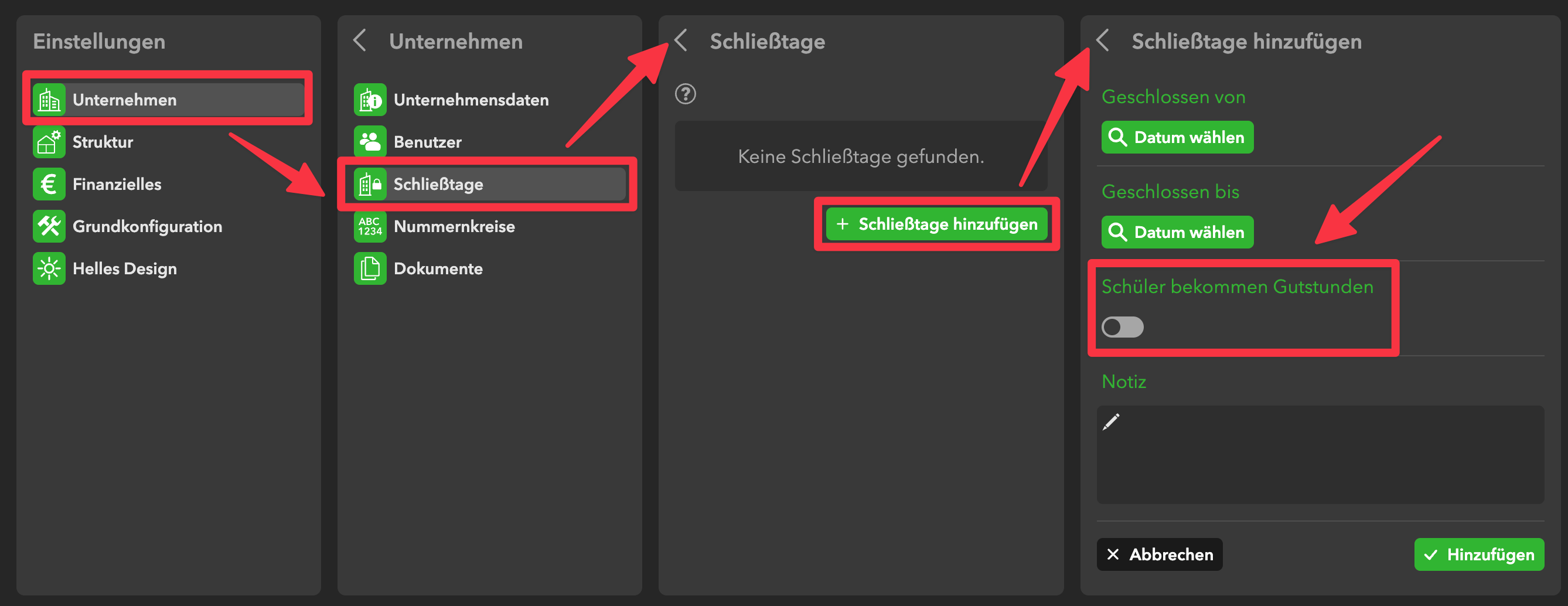 Schüler mit Monatsabo bezahlen dieses trotzdem im vollem Umfang, auch wenn sie wegen der Schließtage weniger Unterricht haben. Damit du dies kompensieren kannst, gibt es ab sofort die Möglichkeit, den Switch „Schüler bekommen Gutstunden“ zu aktivieren: