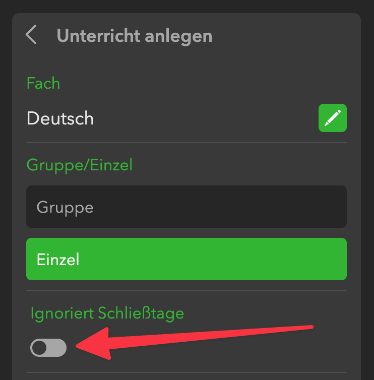 Du kannst Unterrichte, die bewusst während der Schließtage stattfinden sollen, einplanen. Hierbei ist zu beachten, dass du beim Anlegen des Unterrichts den Switch „Ignoriert Schließtage“ aktivierst. Dann taucht der Unterricht wie gewohnt in der „Unterrichte prüfen“ Liste auf und kann abgerechnet werden.