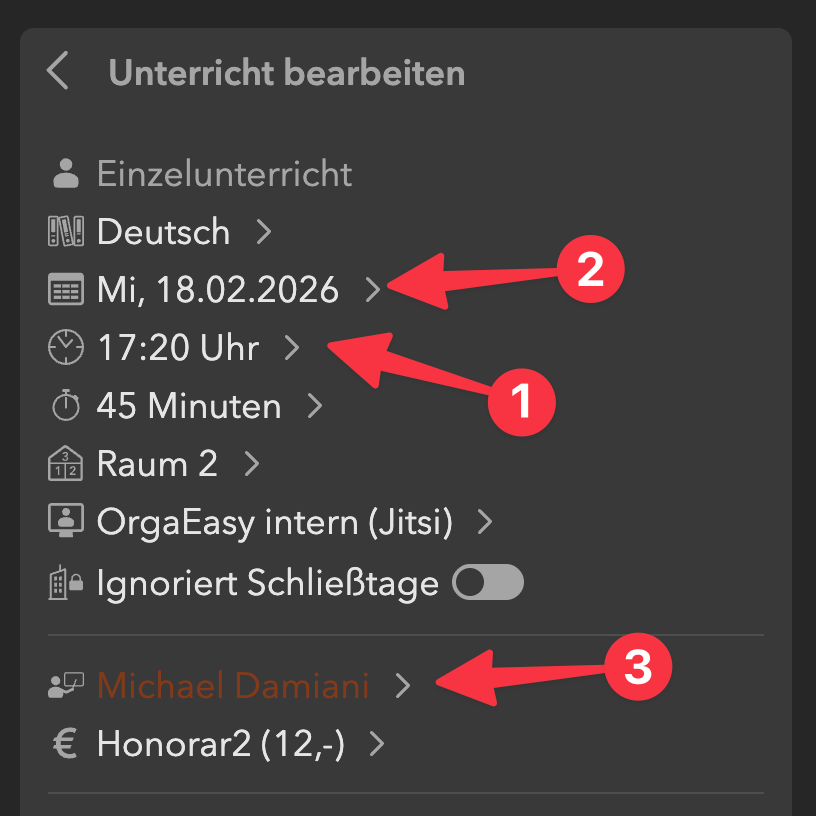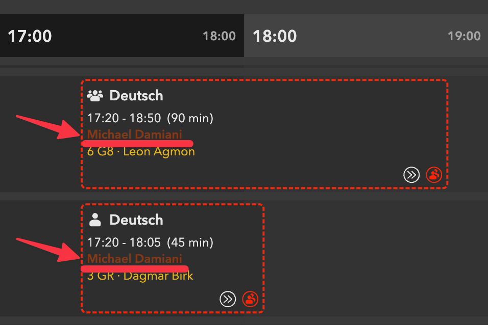 In diesem Beispiel sehen wir, dass die Lehrkraft „Michael Damiani“ für zwei Unterrichte eingeplant wurde, die sich zeitlich überschneiden (beide beginnen um 17:20 Uhr):