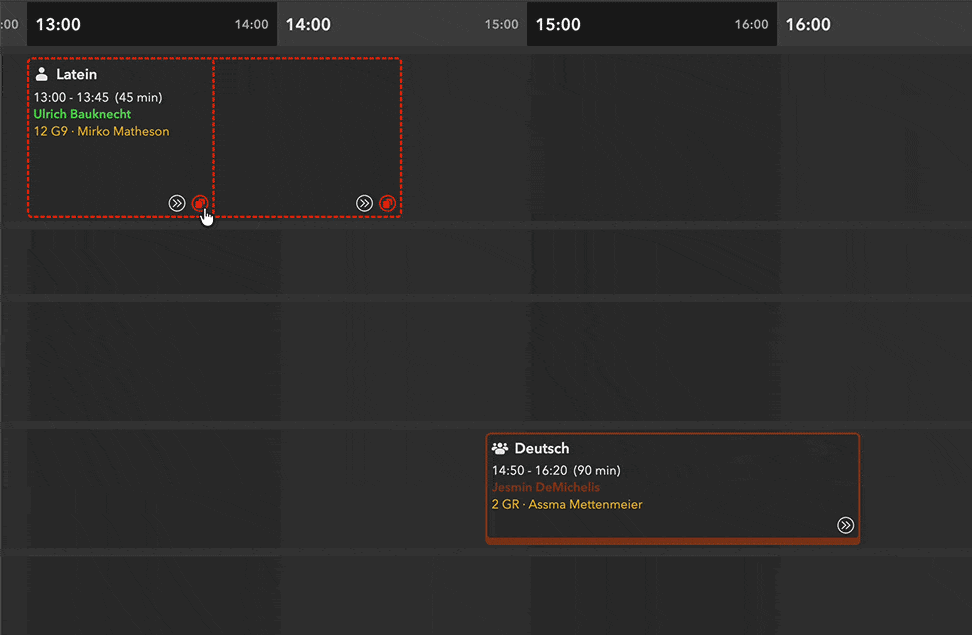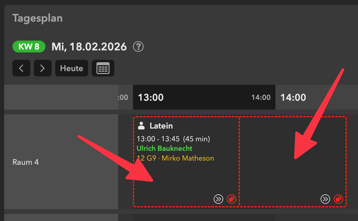 Um entscheiden zu können, welchen der beiden Unterrichte du ändern möchtest, um das Problem zu lösen, musst du zunächst wissen, um welchen Unterricht es sich bei dem längeren handelt. Dessen Informationen werden jedoch in dieser Ansicht von dem darüber liegenden Matheunterricht verdeckt.