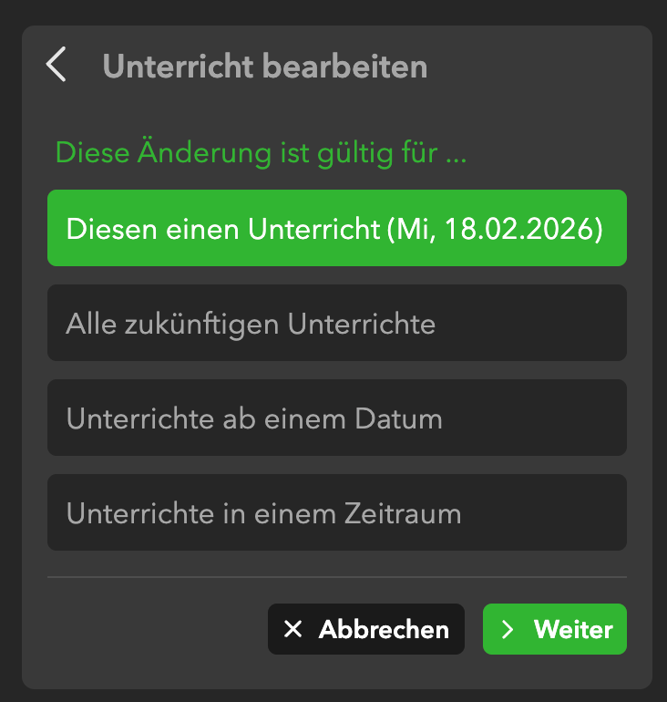 Wähle im nächsten Bildschirm, für welchen Zeitraum du diesen Unterricht ändern möchtest: