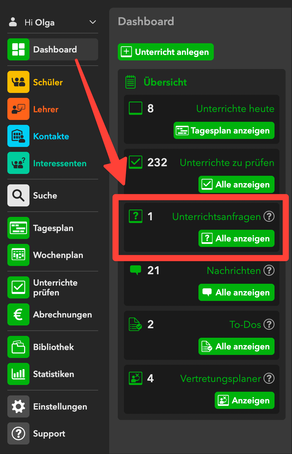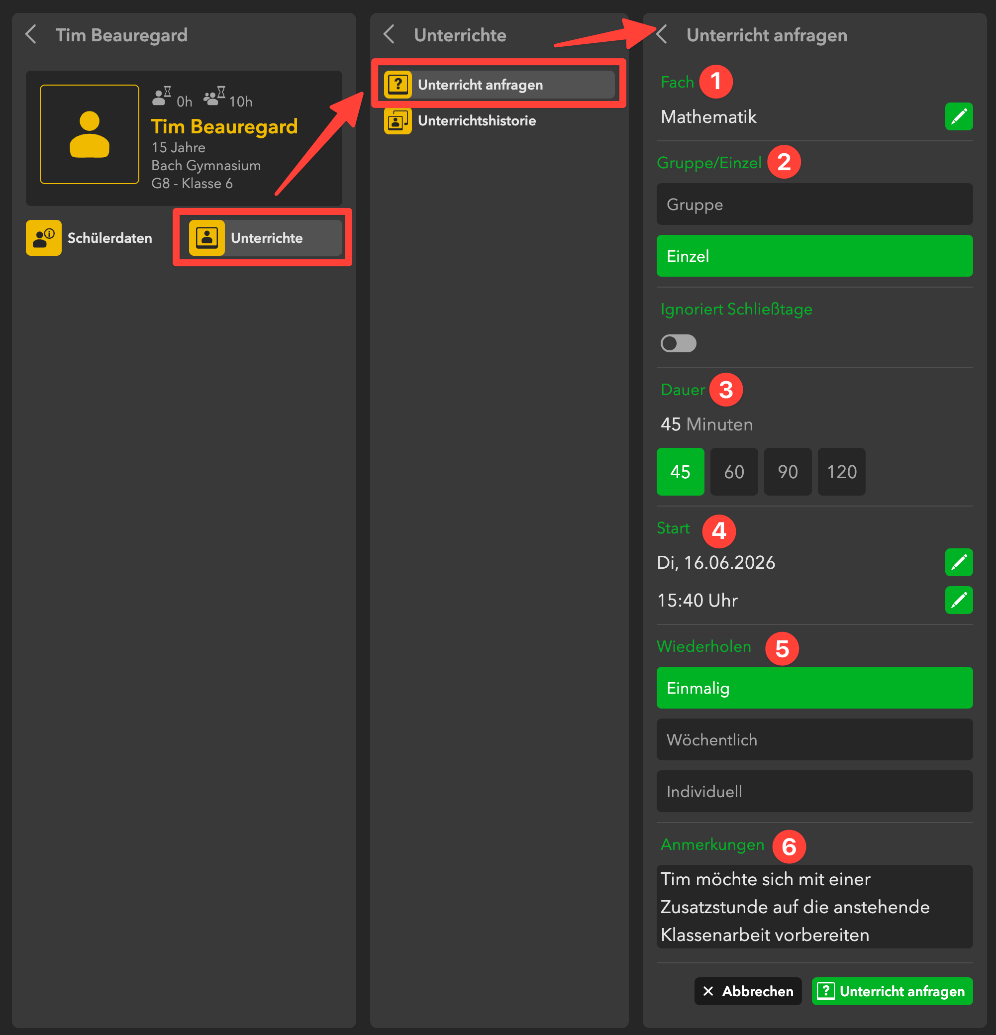 Mit Klick auf „Unterricht anfragen“ wird die Anfrage an die Verwaltung übermittelt.