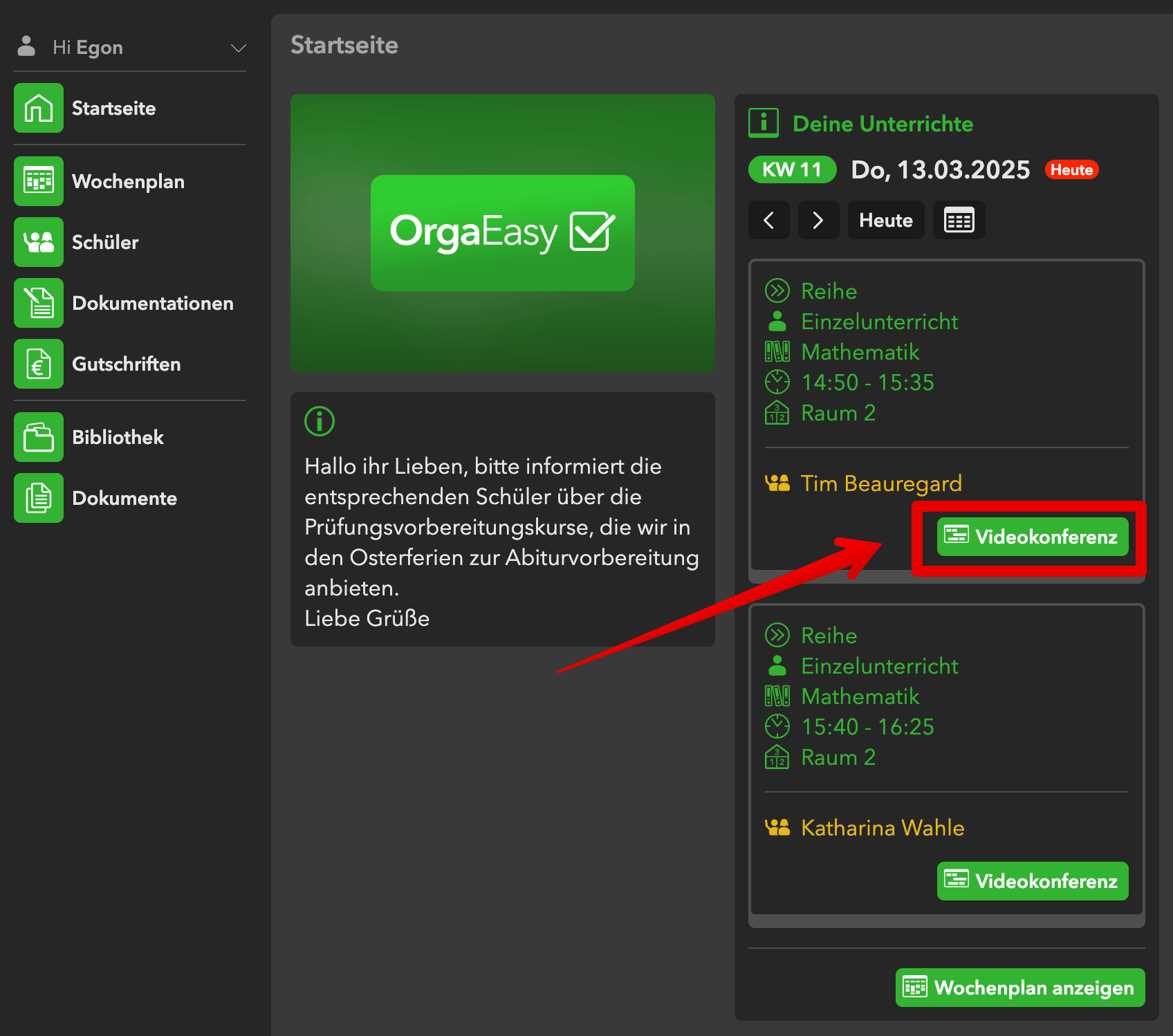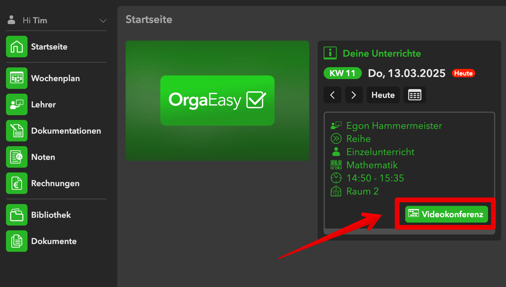 Jeder in OrgaEasy geplante Unterricht kann auch online gehalten werden. Lehrer und Schüler finden in ihrem Online-Portal am Tag des Unterrichts den Button „Videokonferenz“ in der Übersicht: