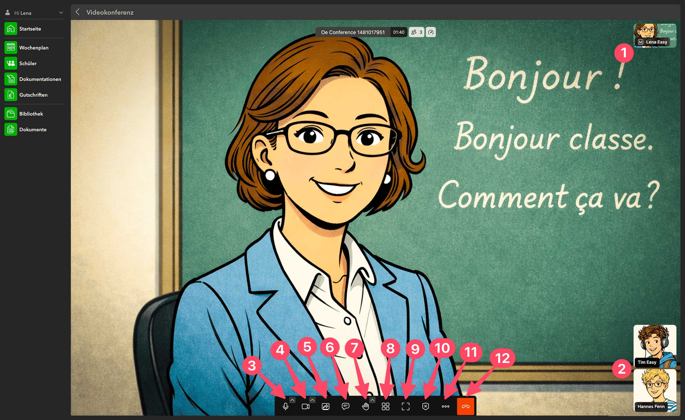 Beide müssen jetzt nur noch zur geplanten Unterrichtszeit auf den Button „Videokonferenz” klicken und treffen sich im automatisch generierten Online-Meeting.