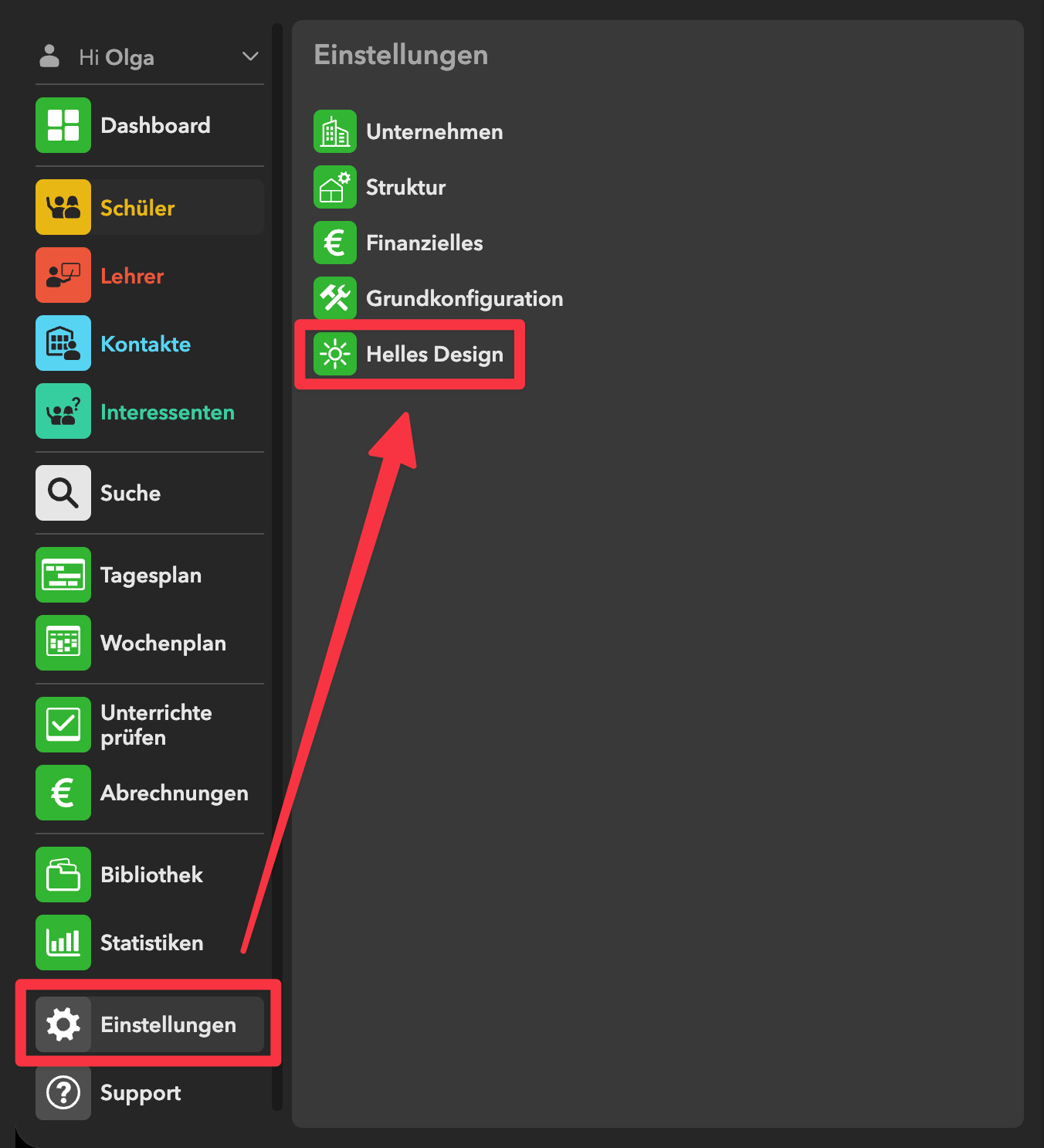 Du kannst das Design von OrgaEasy zwischen hell und dunkel umschalten. Klicke dafür in den Einstellungen auf Helles Design:
