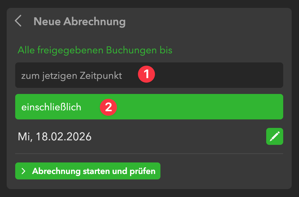 bei dieser Option kannst du angeben, bis zu welchem Datum die Abrechnung erfolgen soll, z.B. wenn du – wie oft üblich – jeden Monat am letzten Tag des Monats abrechnen möchtest. In unserem Beispiel: Du möchtest Anfang Dezember den November abrechnen, dann würdest du 30.11. als Datum eintragen
