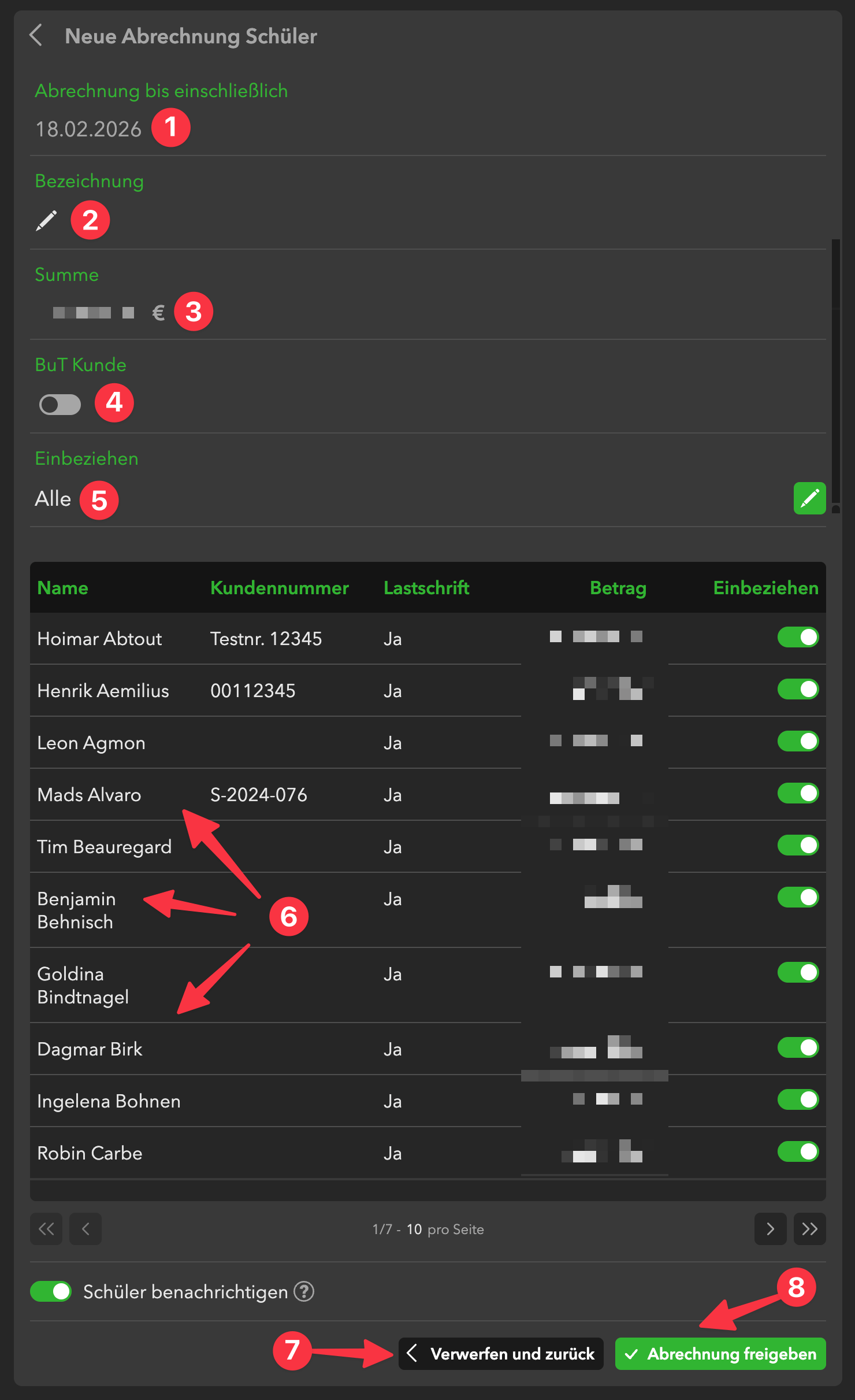 wenn dir bei einer der Positionen ein Fehler aufgefallen ist (z.B. ein falsch ausgewählter Tarif bei einem Unterricht oder eine fälschlich kostenpflichtige Buchung für einen Schüler, der entschuldigt gefehlt hat), kannst du die Abrechnung mit diesem Button einfach abbrechen, den Fehler beheben und die Abrechnung erneut starten