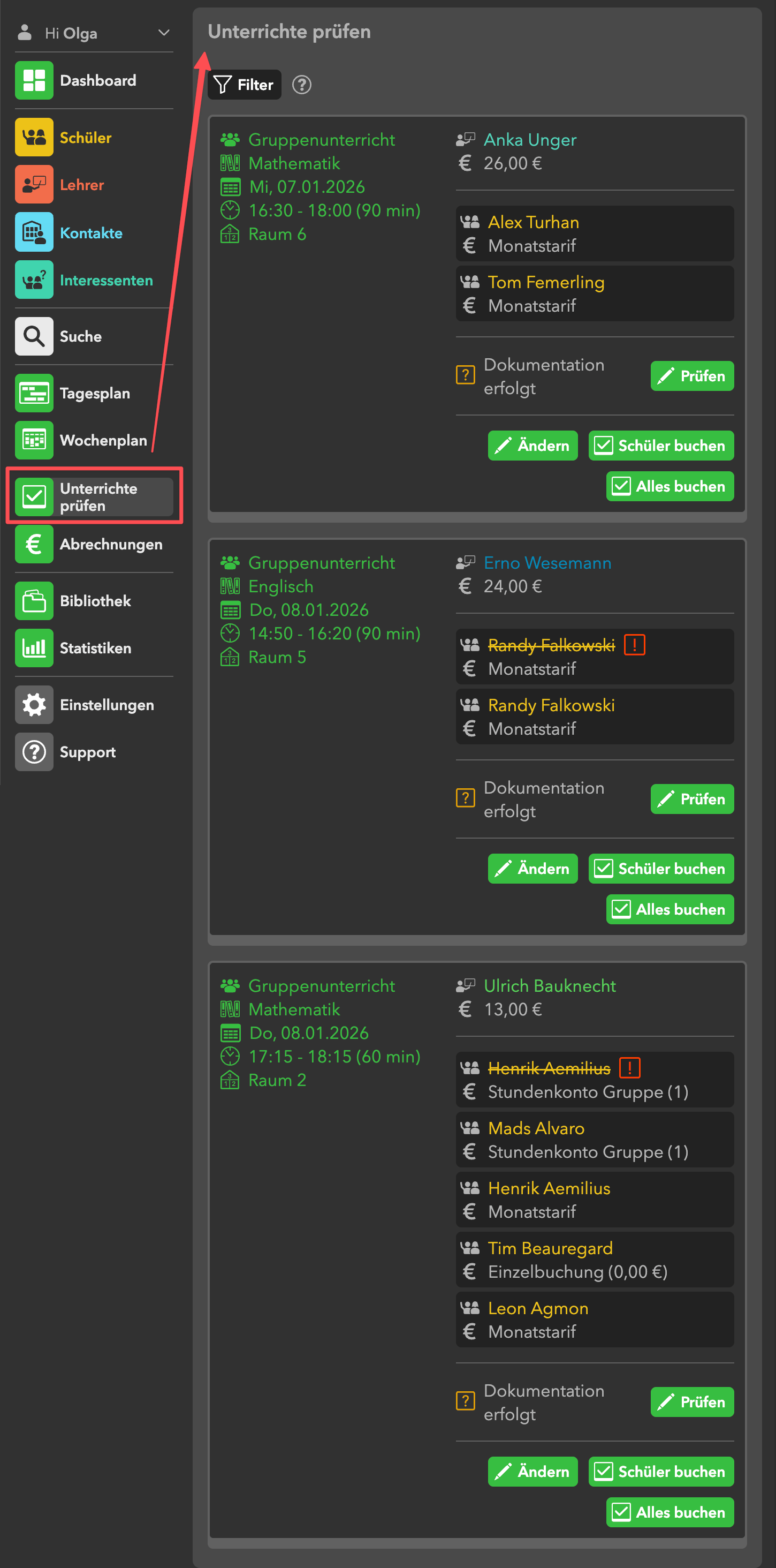 Hier kannst du die stattgefundenen Unterrichte prüfen und bei Bedarf ändern (z.B. wenn ein Lehrer dir mitteilt, dass ein Schüler nicht erschienen ist).