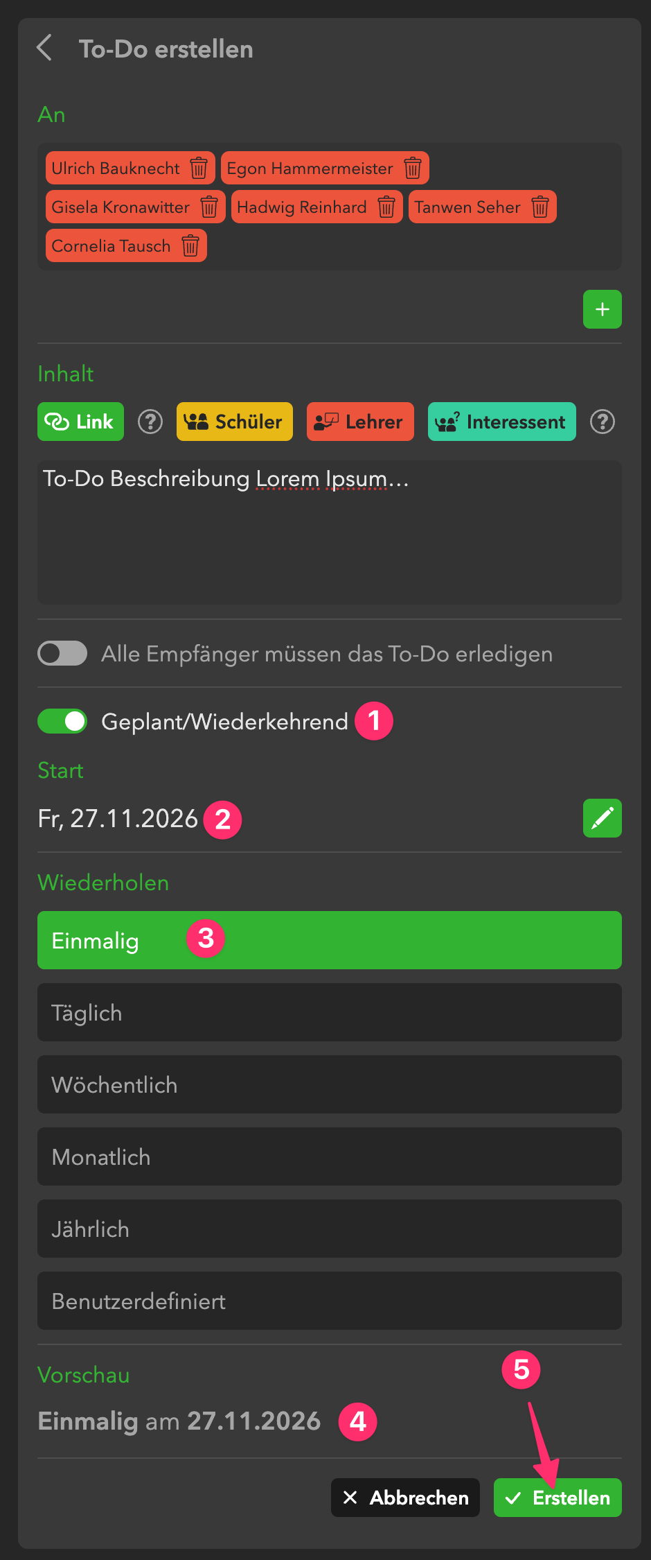 Wiederholen: Wähle hier „Einmalig“, wenn das To-Do nur an einem festen Datum bei den Empfängern angezeigt werden soll.