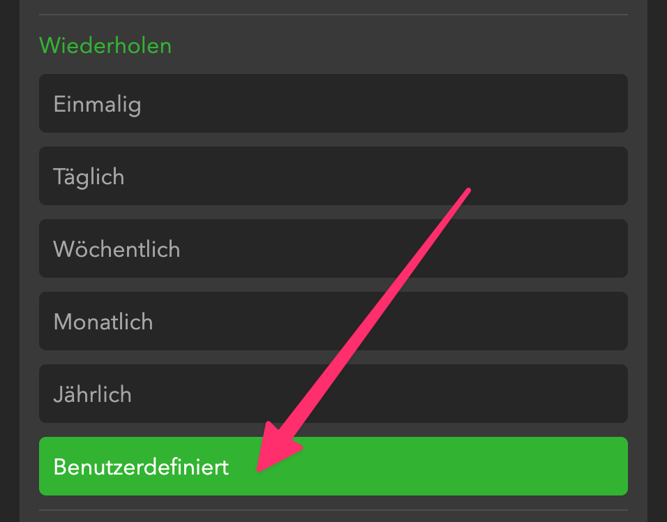 Um ein wiederkehrendes To-Do mit einem individuellen Wiederholungs-Intervall zu erstellen, wähle im Bereich „Wiederholen“ den Eintrag „Benutzerdefiniert“:
