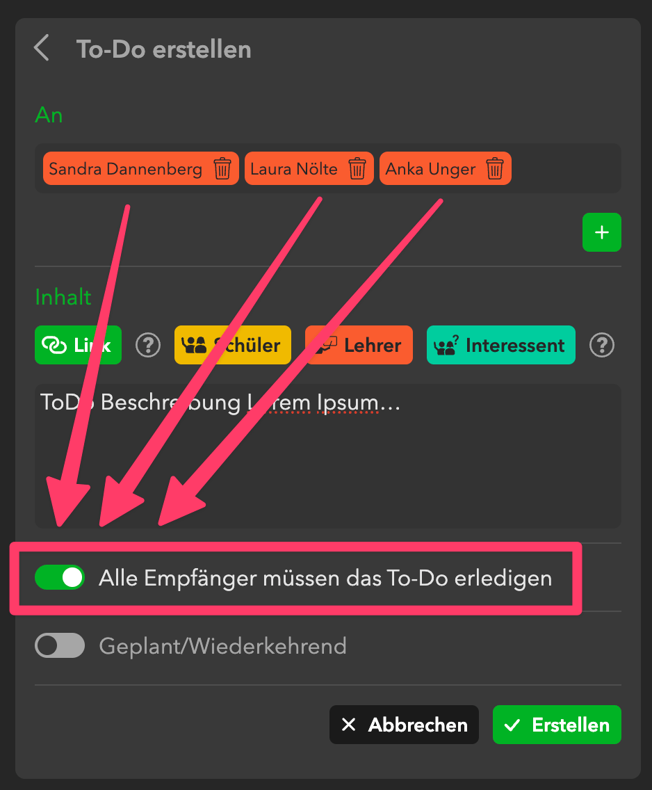 Schalter an: Die Aufgabe gilt erst als erfüllt, wenn alle Empfänger sie als „erledigt“ markiert haben.