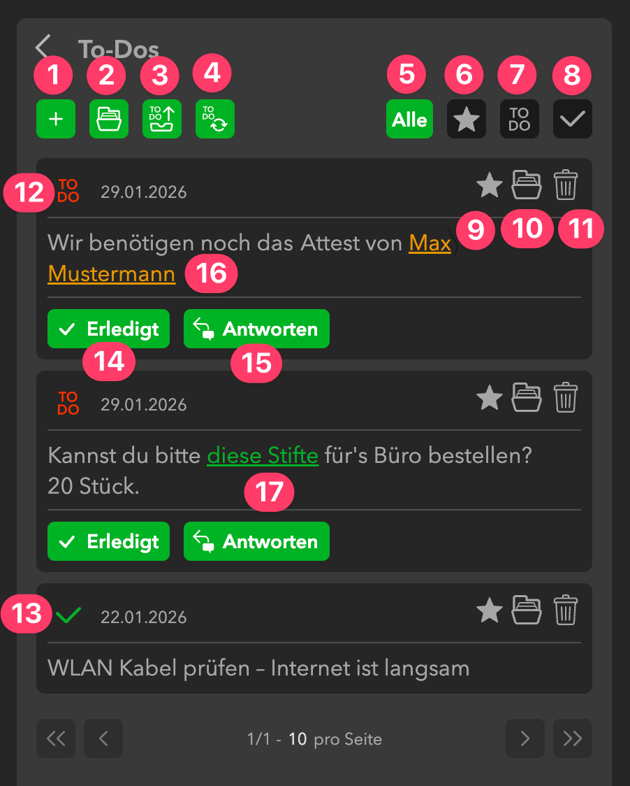 Filter: Hier kannst du die Liste filtern und dir nur ausgewählte Kategorien anzeigen lassen: Favoriten, offene To-Dos, erledigte To-Dos.