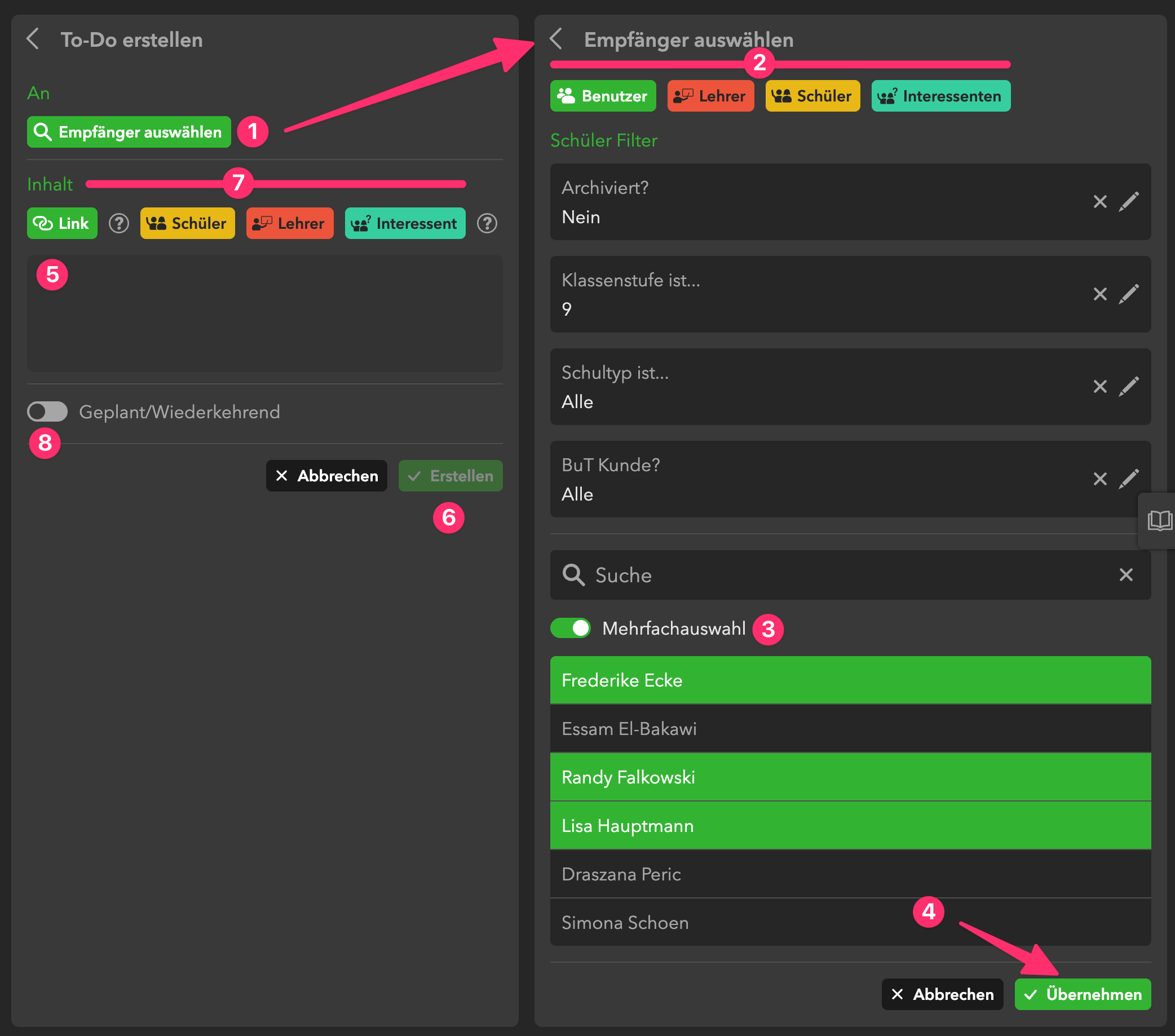 Empfänger auswählen: Klicke auf diesen Button, um festzulegen, wem das To-Do zugeteilt werden soll. Nach dem Klick öffnet sich ein neues Panel. Nachdem du einen oder mehrere erste Empfänger ausgewählt hast, werden dir diese hier angezeigt. Zusätzlich erscheint ein „+“ Button, mit dem du weitere Empfänger hinzufügen kannst. Du kannst die Art der Empfänger (Benutzer, Lehrer, Schüler oder Interessenten) mischen.