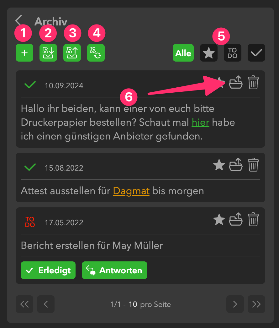 Klicke auf den „Archivieren“ Button, um ein To-Do ins Archiv zu verschieben: