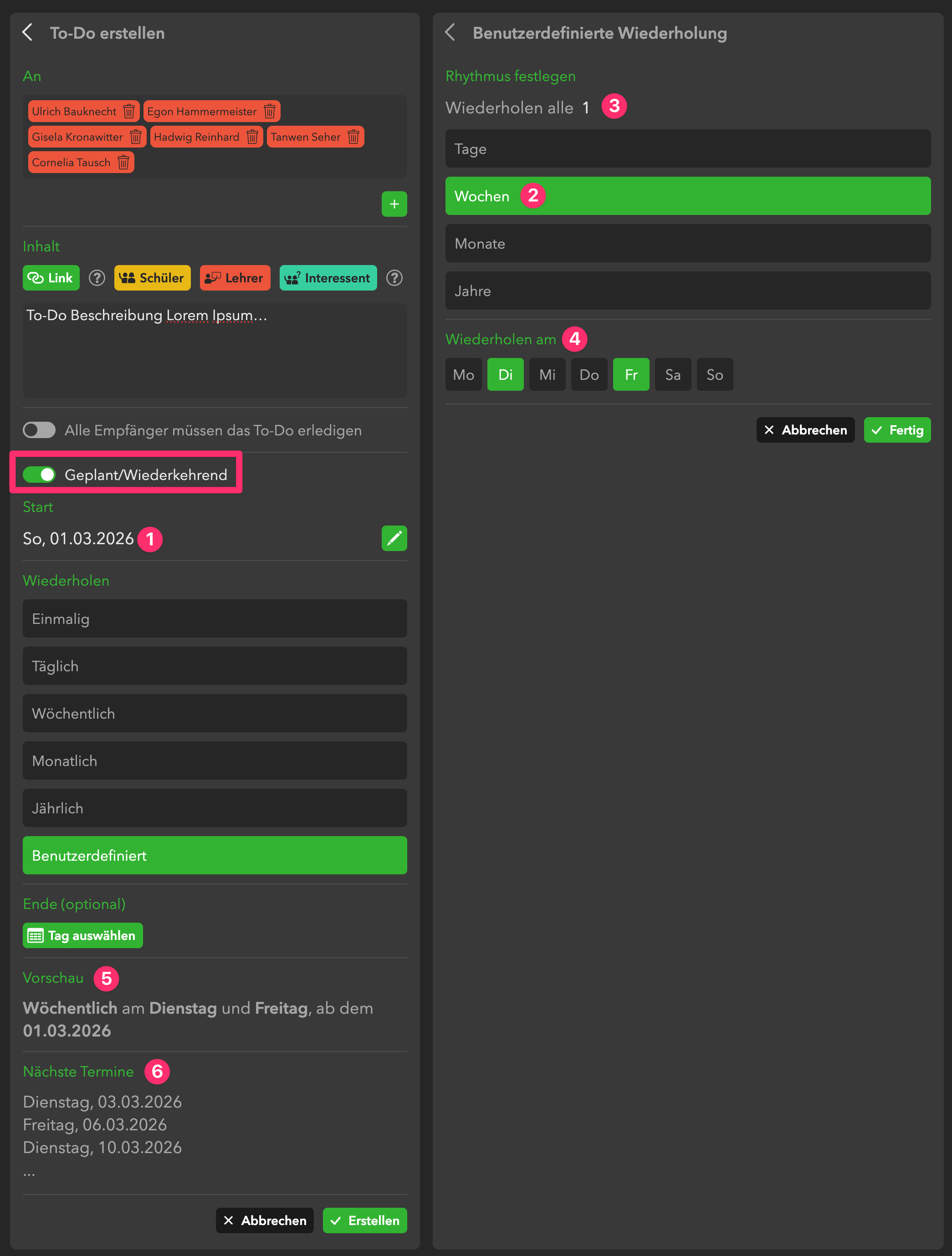 In diesem Beispiel wird das To-Do den Empfängern ab dem 01.03.2026 automatisch jede Woche Dienstags und Freitags angezeigt.