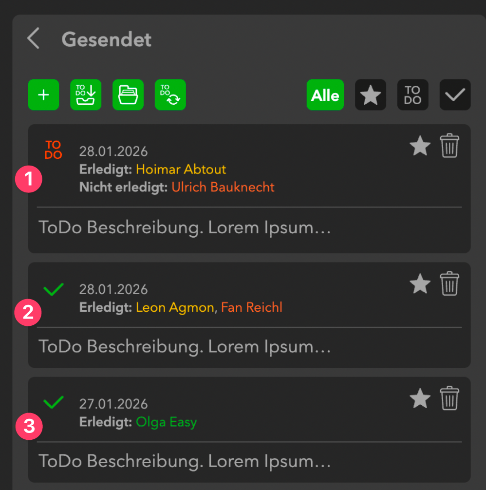 Gesendet: Öffnet den To-Do-Ausgang. Hier siehst du alle To-Dos, die du erstellt und versendet hast.