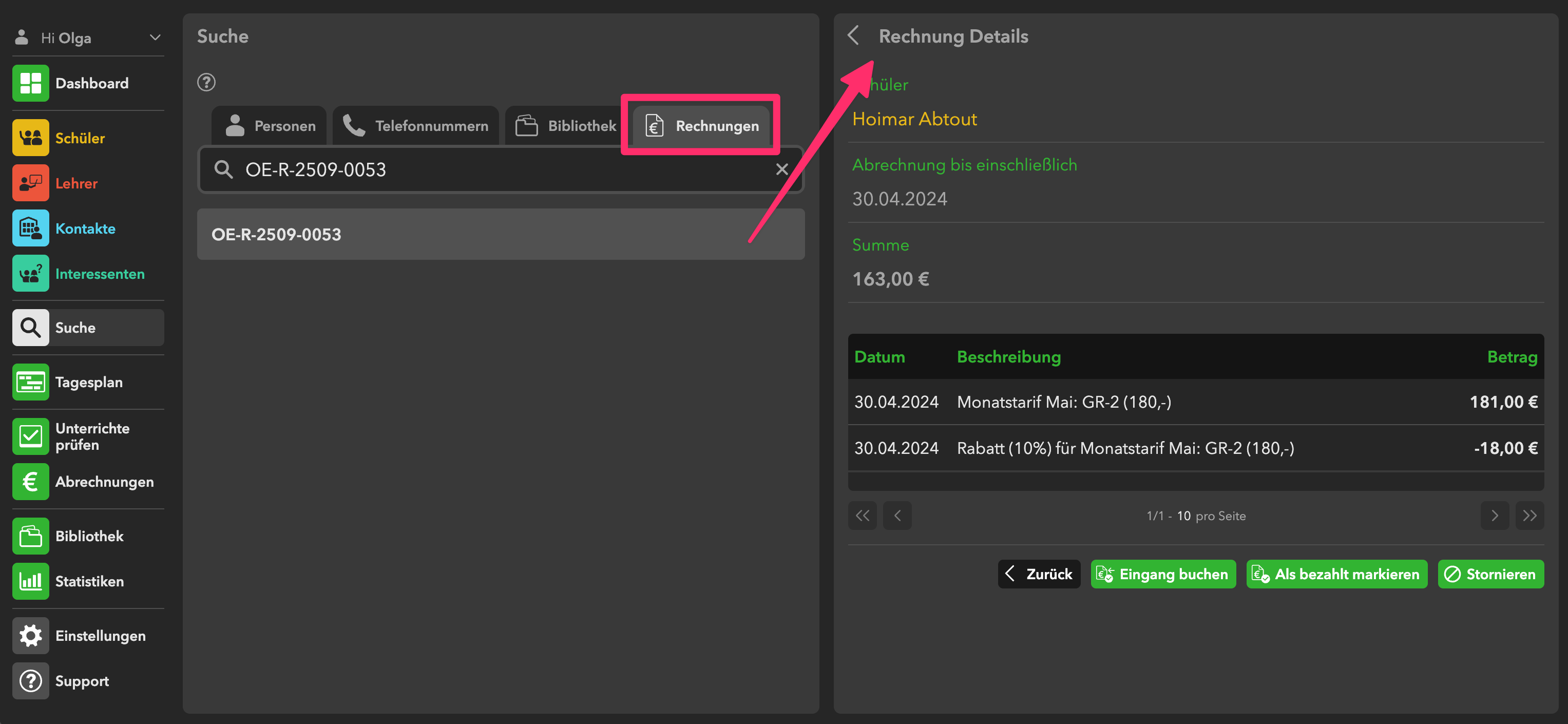 Klicke auf den Reiter „Rechnungen“, um nach einer Rechnung anhand ihrer Rechnungsnummer zu suchen.