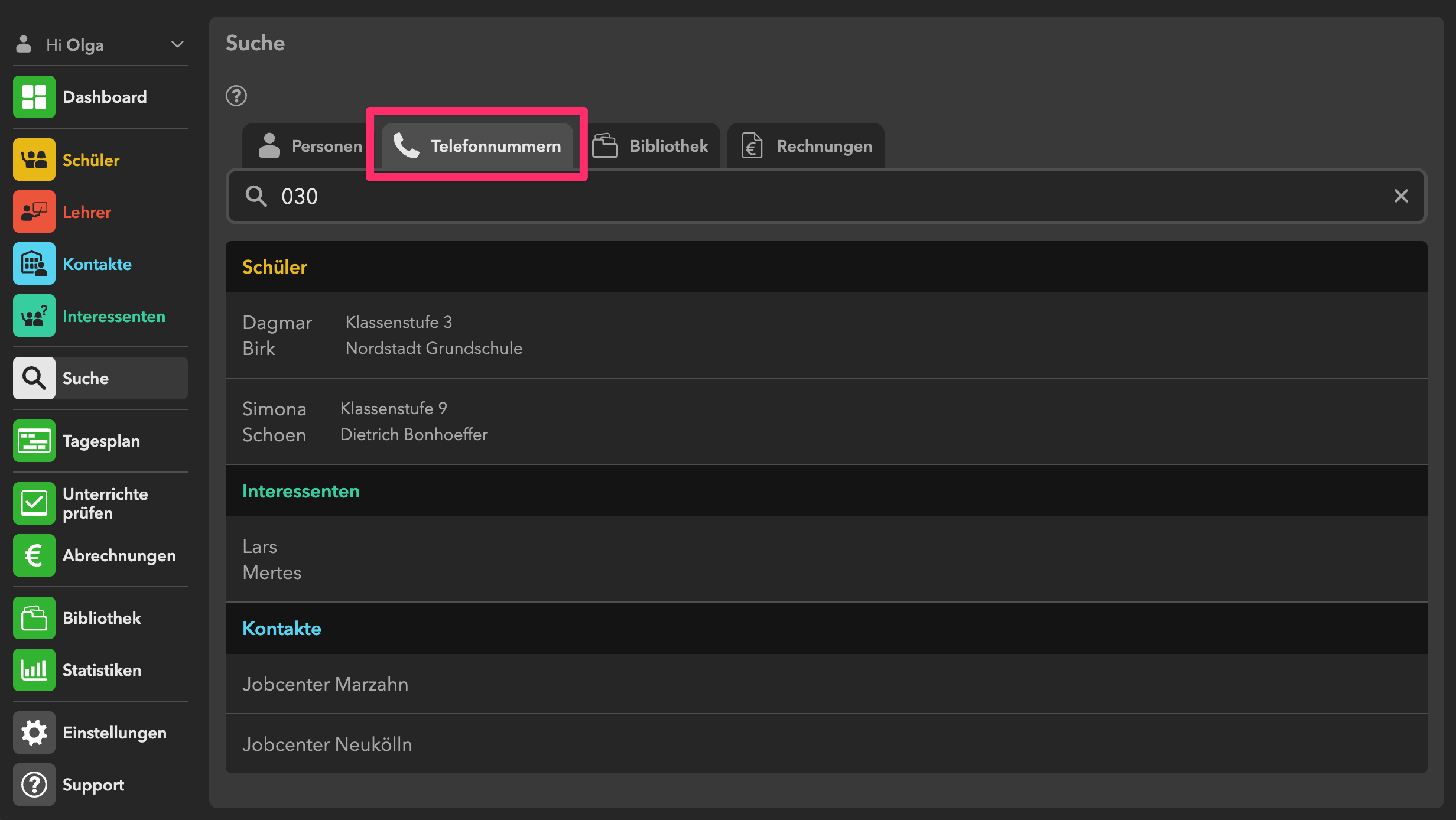 Im gezeigten Beispiel wurde die Vorwahl 030 eingegeben. Daher erscheinen alle Einträge deiner Stammdaten, die eine Berliner Telefonnummer besitzen.