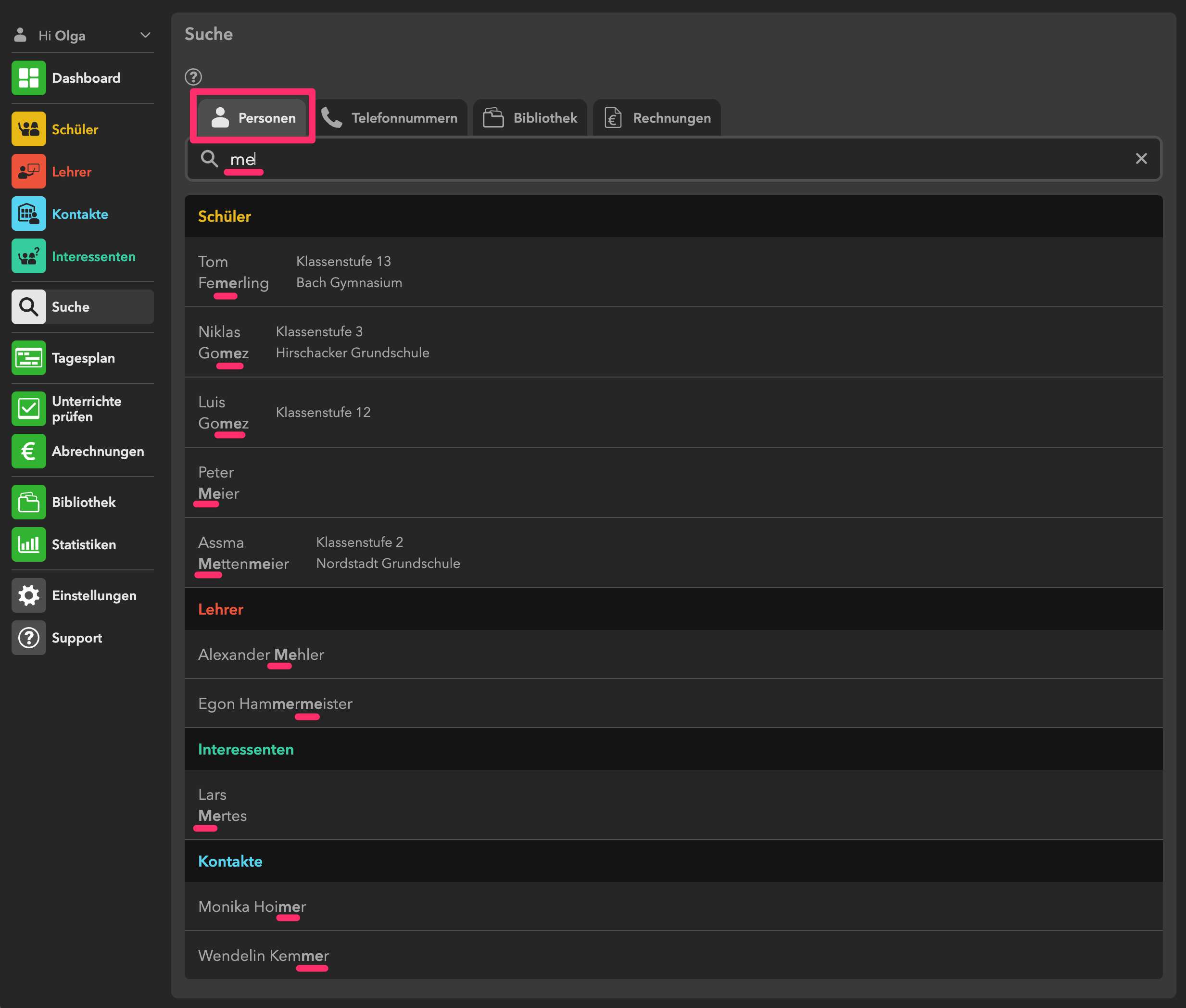 Gib den Namen der Person, die du suchst ein. Oft reichen schon die ersten Buchstaben. Im Beispiel oben wurde z.B. nur „me“ eingegeben, die Suche zeigt dir dann schon die ersten Suchergebnisse.